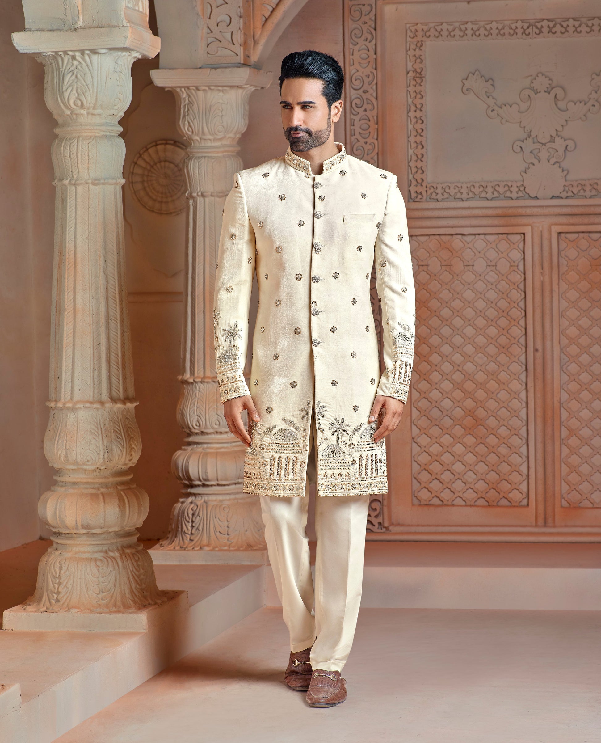 Exude royal charm with our Micro Velvet Indo-Western Set, designed for the modern man who appreciates timeless luxury. Crafted from rich micro velvet fabric, this ensemble features exquisite daman embroidery adorned with fine beadwork that adds a regal sparkle to your look. The soft, lustrous texture of the velvet offers both comfort and grandeur, making it ideal for weddings, receptions, and festive celebrations. With its refined craftsmanship and elegant silhouette, this Indo-Western set defines sophistication and style.
