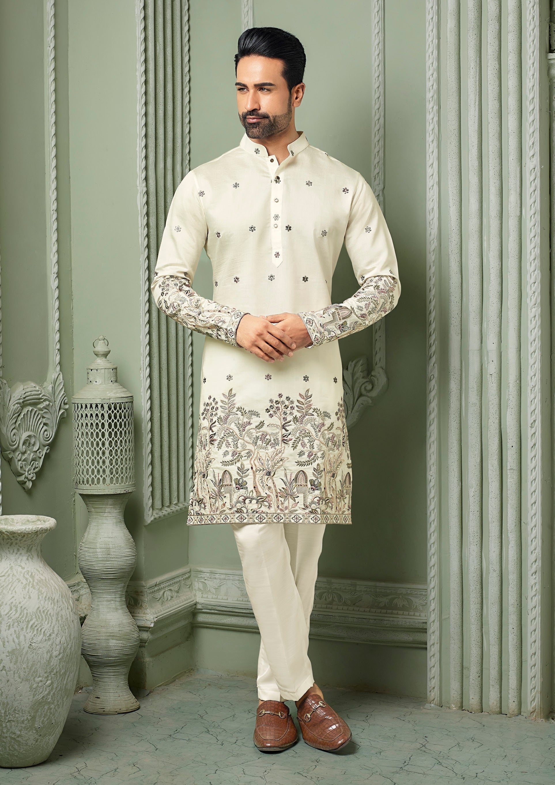 Redefine sophistication with our Rich Silk Kurta Set, designed for the modern man who embraces timeless ethnic elegance. Crafted from premium natural soft silk, this kurta features fine threaded embroidery work that reflects exquisite craftsmanship and attention to detail. Paired with a plain silk pant, the ensemble offers a perfect balance of tradition and contemporary charm — ideal for weddings, festivals, and special celebrations. The rich silk texture gives a natural sheen and a graceful fall, ensuring you stand out effortlessly in every occasion.