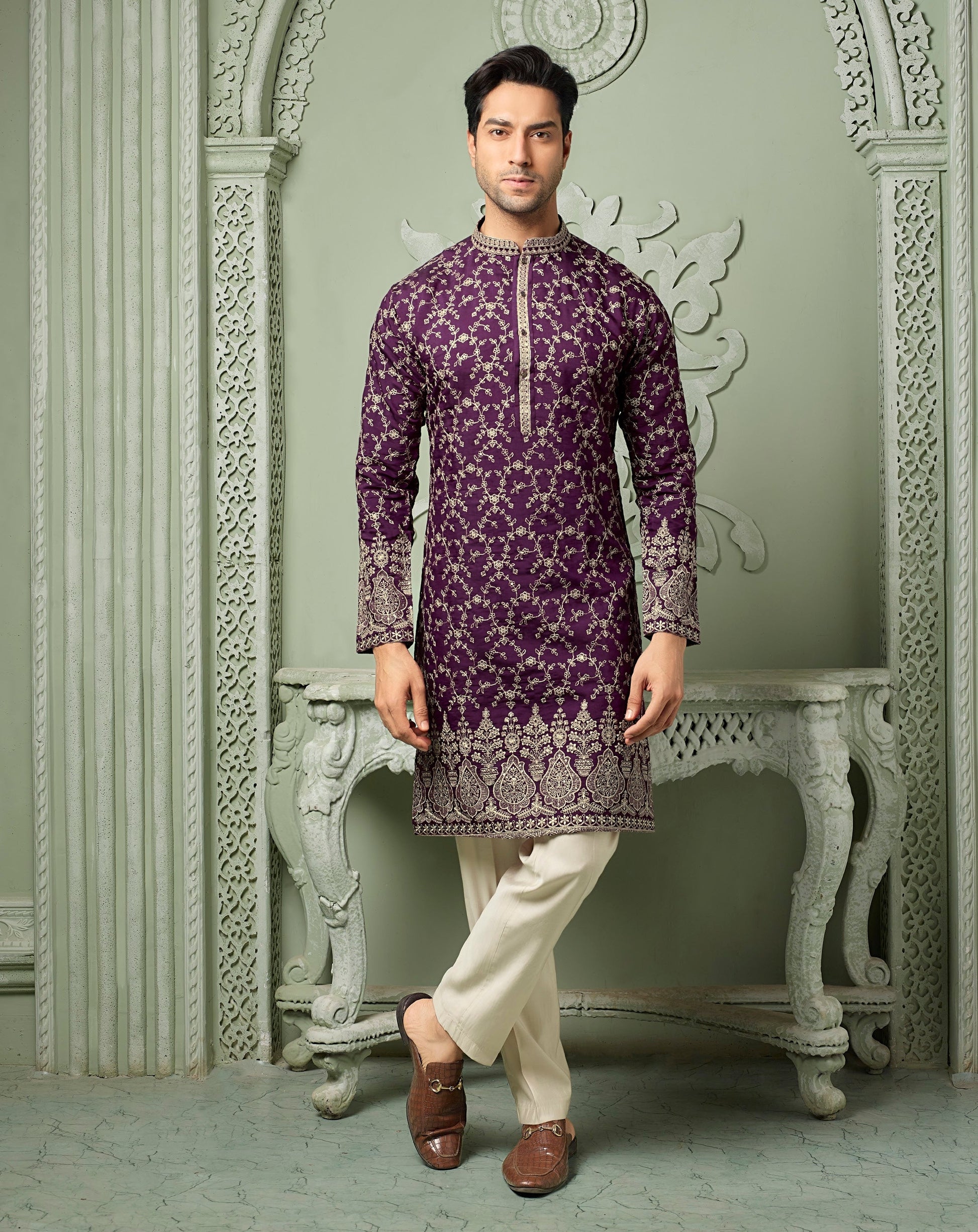 Redefine sophistication with our Rich Silk Kurta Set, designed for the modern man who embraces timeless ethnic elegance. Crafted from premium natural soft silk, this kurta features fine threaded embroidery work that reflects exquisite craftsmanship and attention to detail. Paired with a plain silk pant, the ensemble offers a perfect balance of tradition and contemporary charm — ideal for weddings, festivals, and special celebrations. The rich silk texture gives a natural sheen and a graceful fall, ensuring you stand out effortlessly in every occasion.