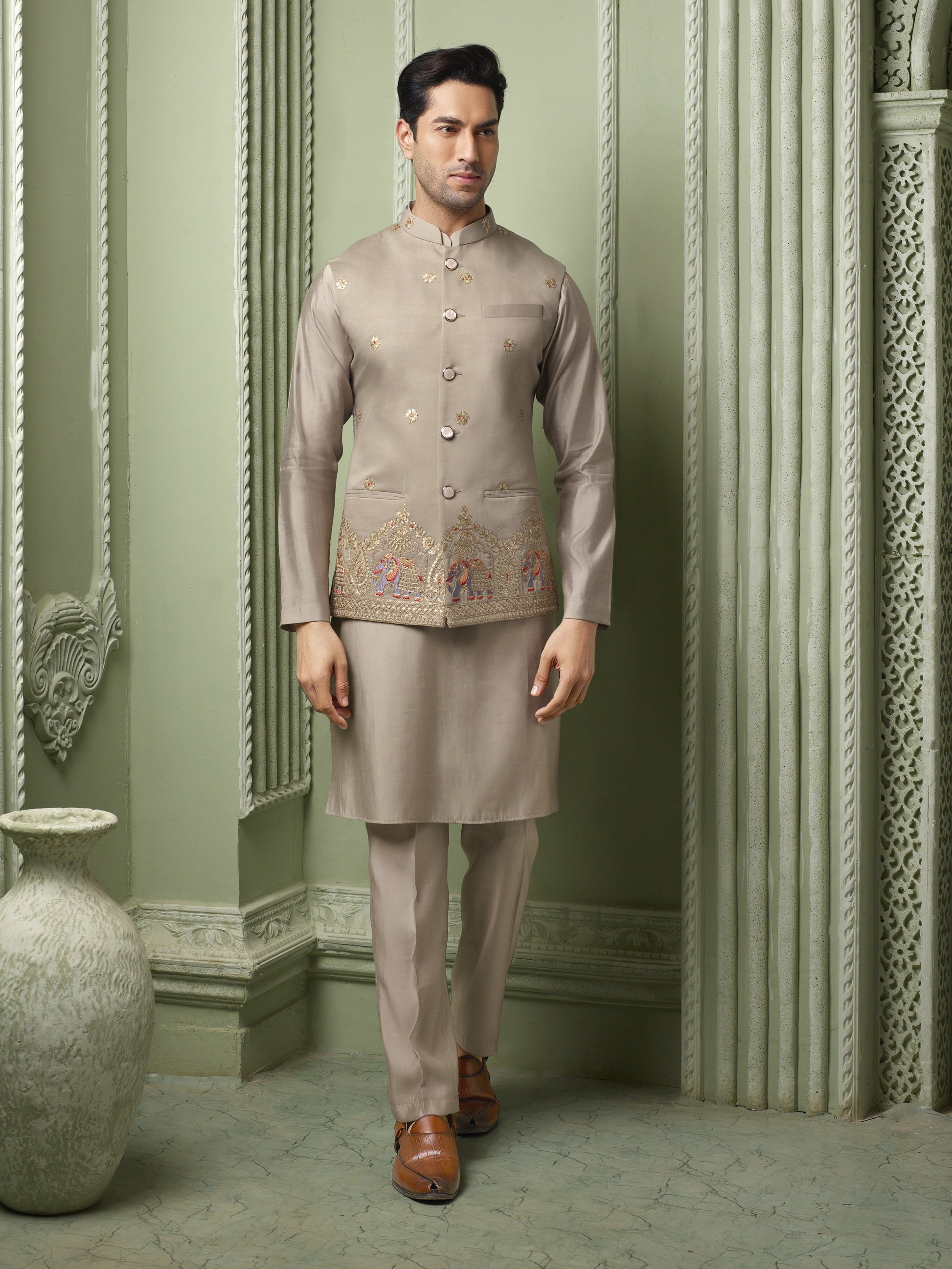 Add a royal touch to your ethnic wardrobe with our Silk Nehru Jacket Set, a perfect fusion of tradition and refined style. The Nehru jacket, made from premium soft silk, features intricate threaded embroidery work that highlights fine craftsmanship and elevates your festive look. Paired with a plain silk kurta and pant, this ensemble exudes understated luxury and comfort — ideal for weddings, receptions, festivals, and cultural celebrations. The smooth silk texture gives a lustrous sheen and a sophisticated finish, ensuring you stand out with effortless grace.