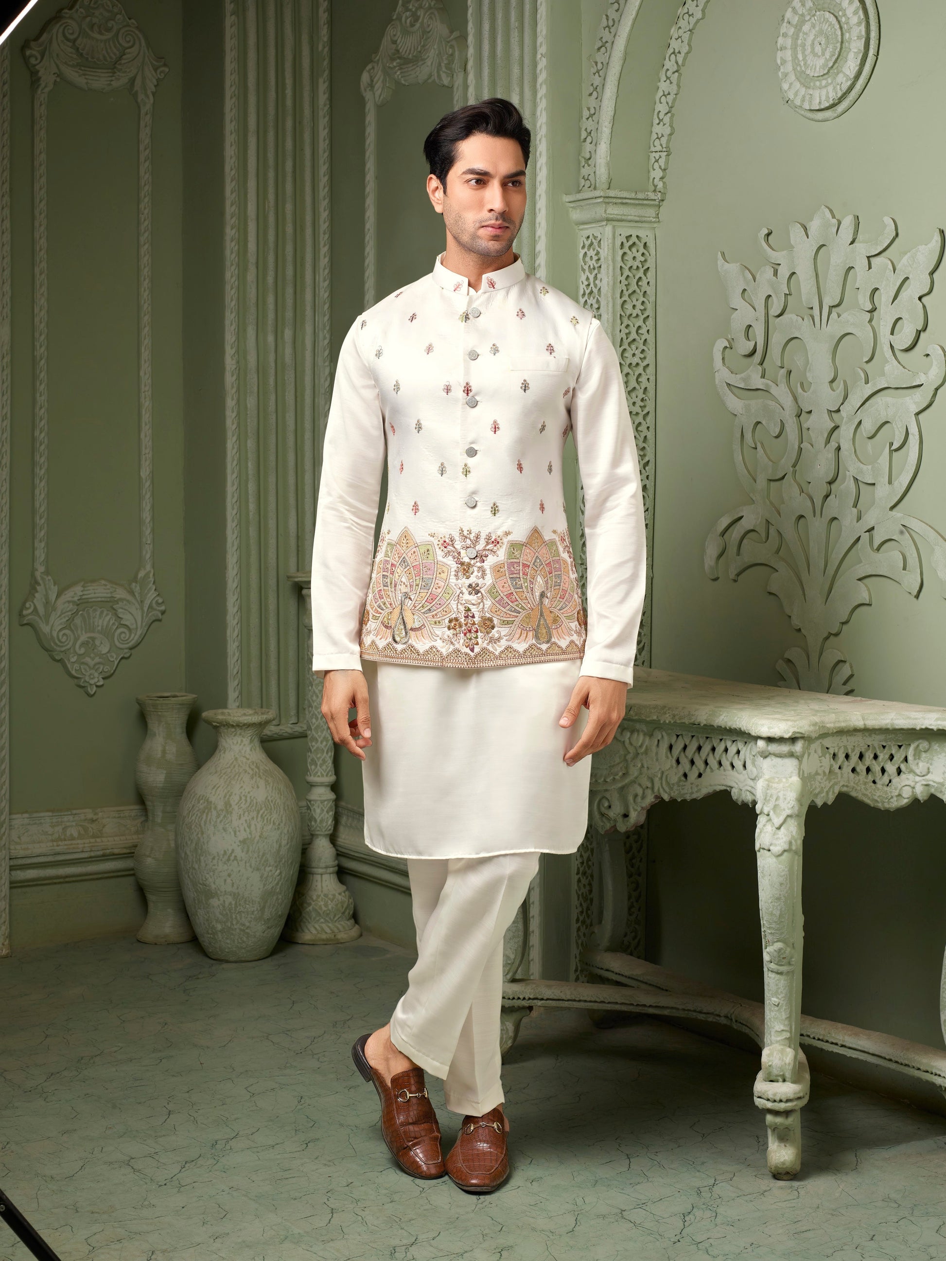 Add a royal touch to your ethnic wardrobe with our Silk Nehru Jacket Set, a perfect fusion of tradition and refined style. The Nehru jacket, made from premium soft silk, features intricate threaded embroidery work that highlights fine craftsmanship and elevates your festive look. Paired with a plain silk kurta and pant, this ensemble exudes understated luxury and comfort — ideal for weddings, receptions, festivals, and cultural celebrations. The smooth silk texture gives a lustrous sheen and a sophisticated finish, ensuring you stand out with effortless grace.