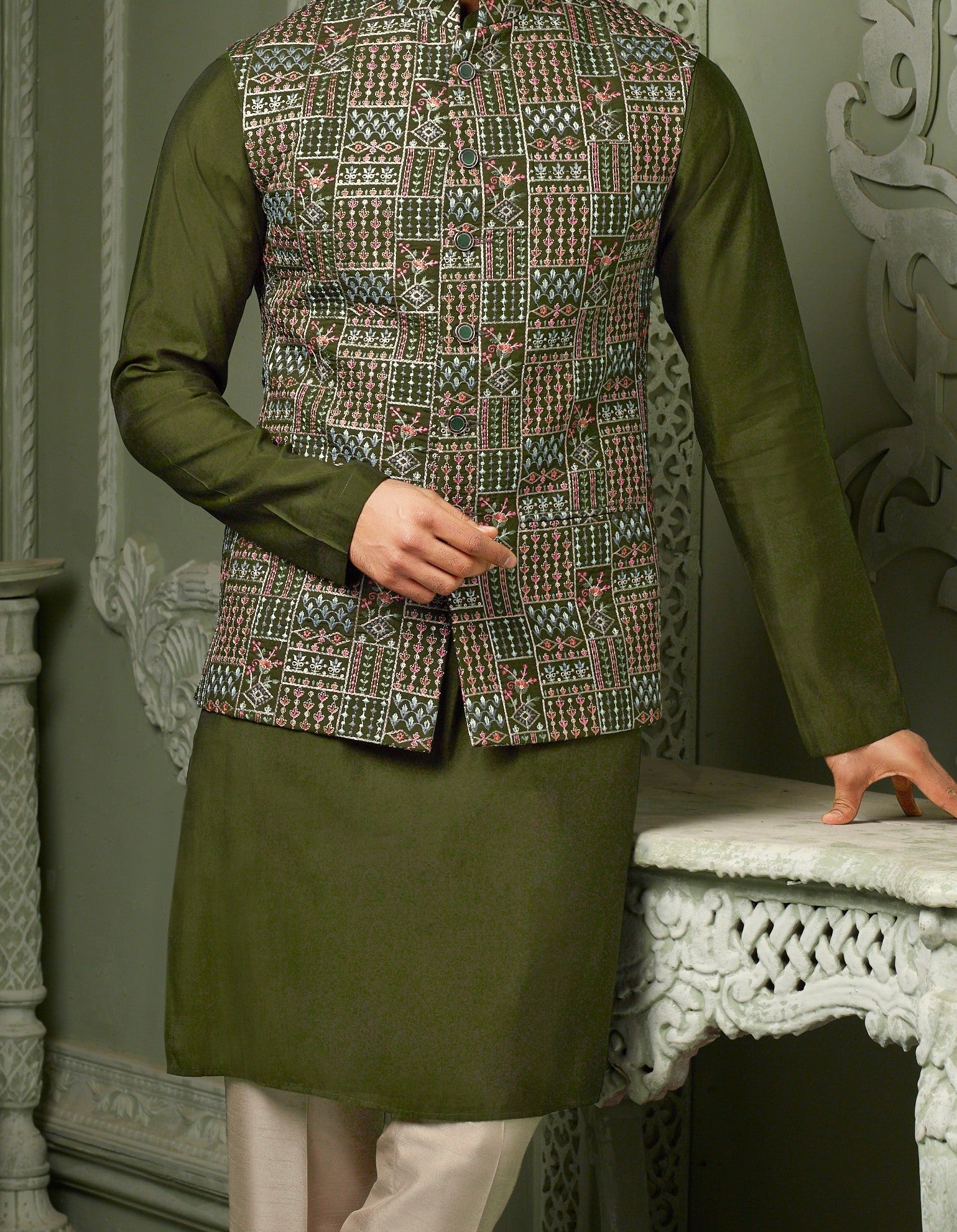 Green silk with multi colour thread work koti with plain kurta and cream pant