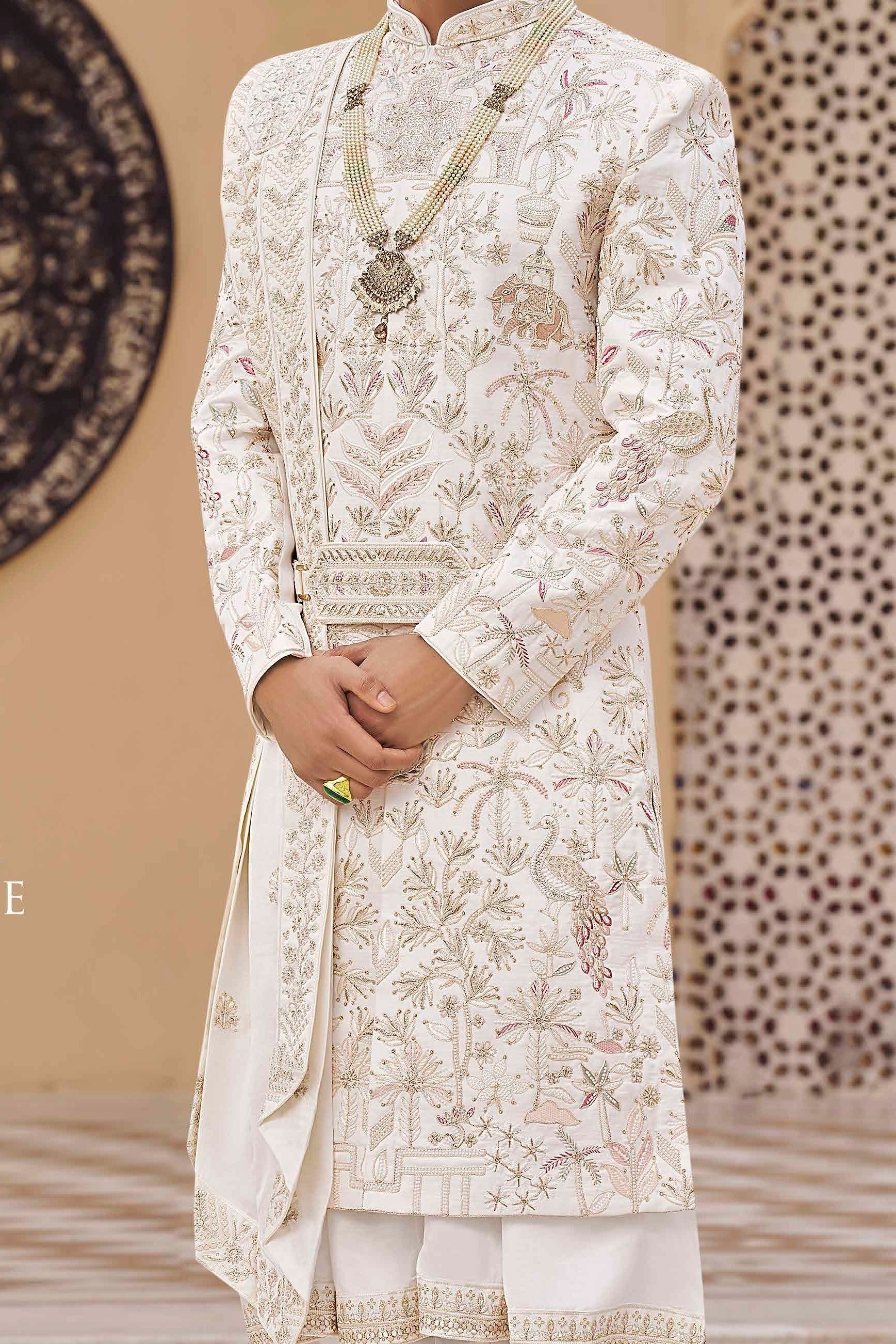 Immerse yourself in timeless elegance with our Classic White Art Silk Sherwani, crafted exclusively for the modern groom who values sophistication. The serene white tone exudes royalty, while the rich Art Silk fabric offers a luxurious sheen and smooth finish. Designed with impeccable craftsmanship, this sherwani enhances your presence at weddings, receptions, or festive celebrations. Pair it with tailored pants or churidar to complete the regal look.