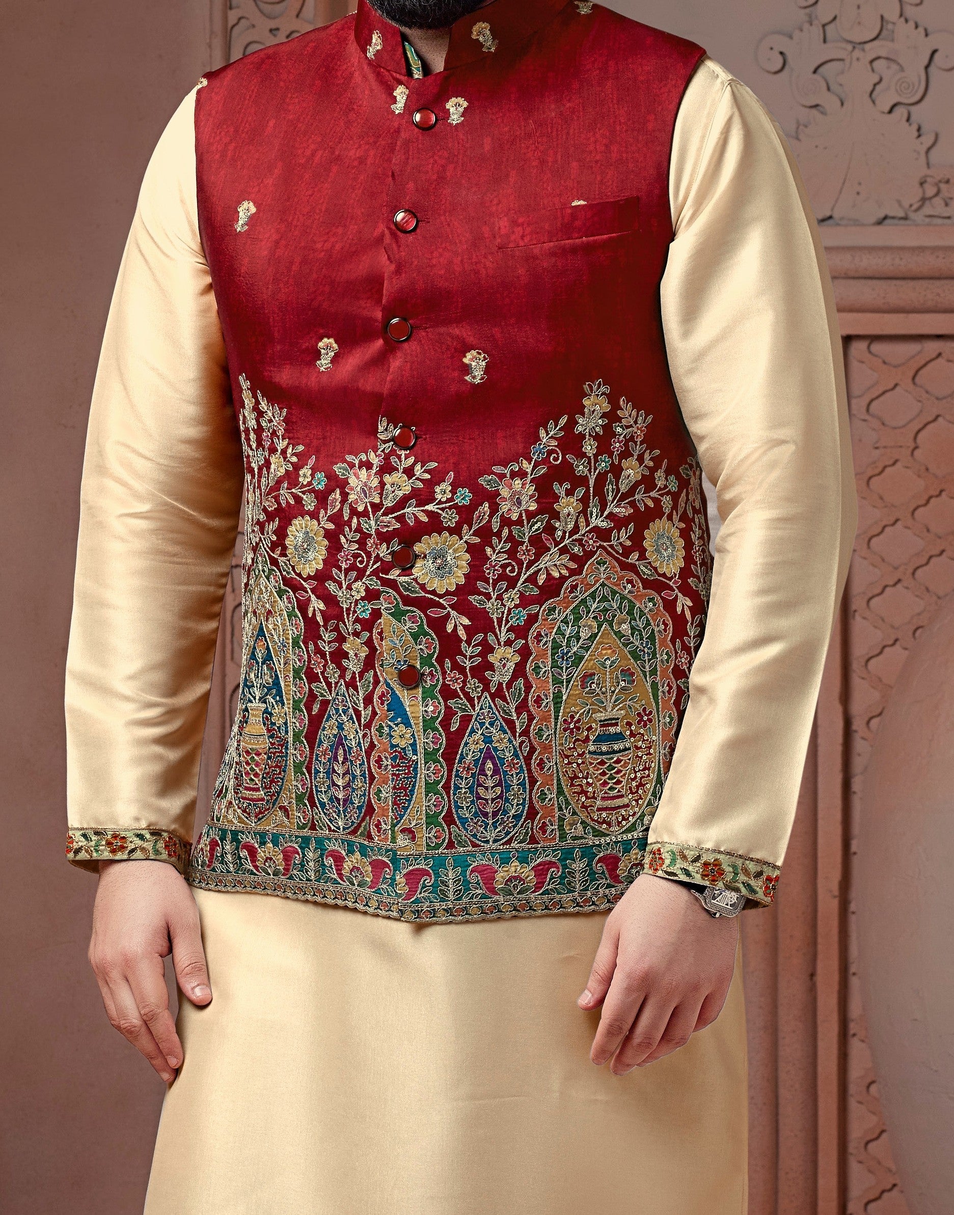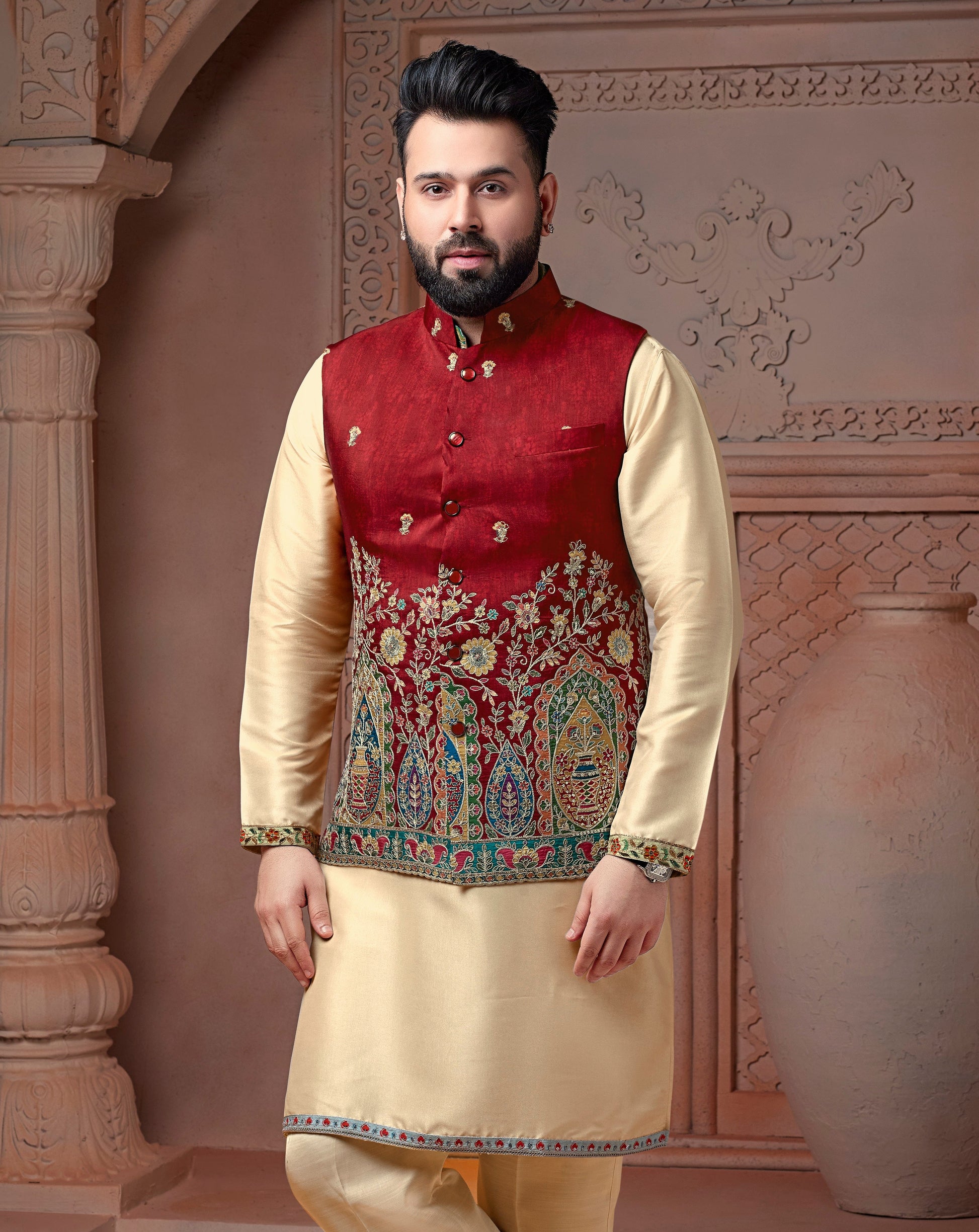 Product Description: Step into timeless elegance with our Multi-Colour Natural Soft Silk Koti and Plain Kurta set with golden zari and corded embroidery, thoughtfully crafted for the modern man who values tradition with a touch of sophistication. Made from premium natural soft silk, this kurta offers a luxurious feel, unmatched comfort, and a graceful drape for any special occasion.